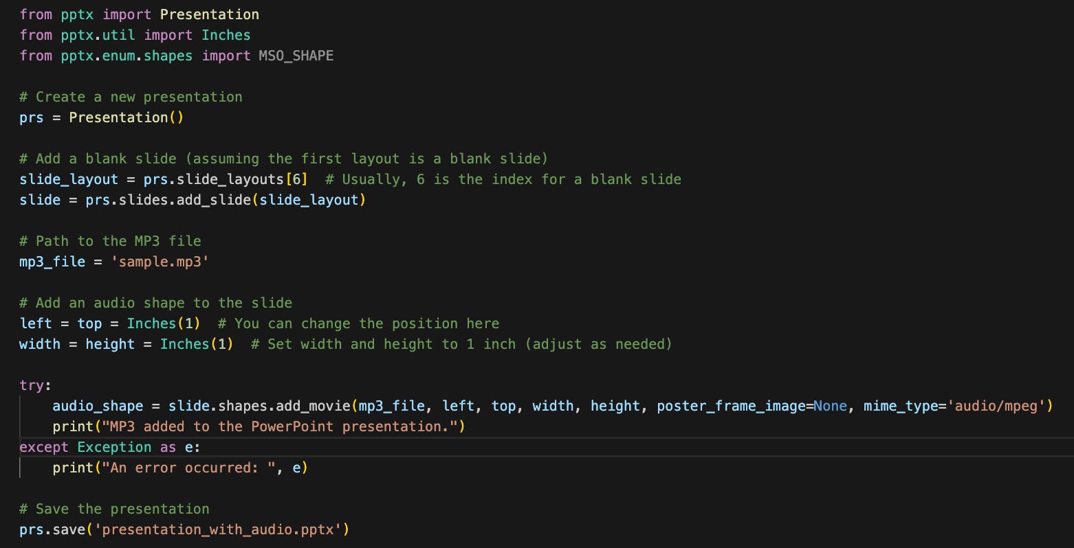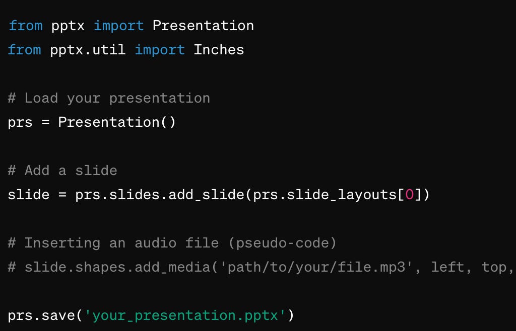 It all started with a seemingly simple task: adding MP3 files to PowerPoint presentations. With Whisper for audio processing and GPT-4 for coding, I was all set. Or so I thought. The `pptx` Python package was crucial, but GPT-4, despite its brilliance, was dropping the ball on detailed instructions.